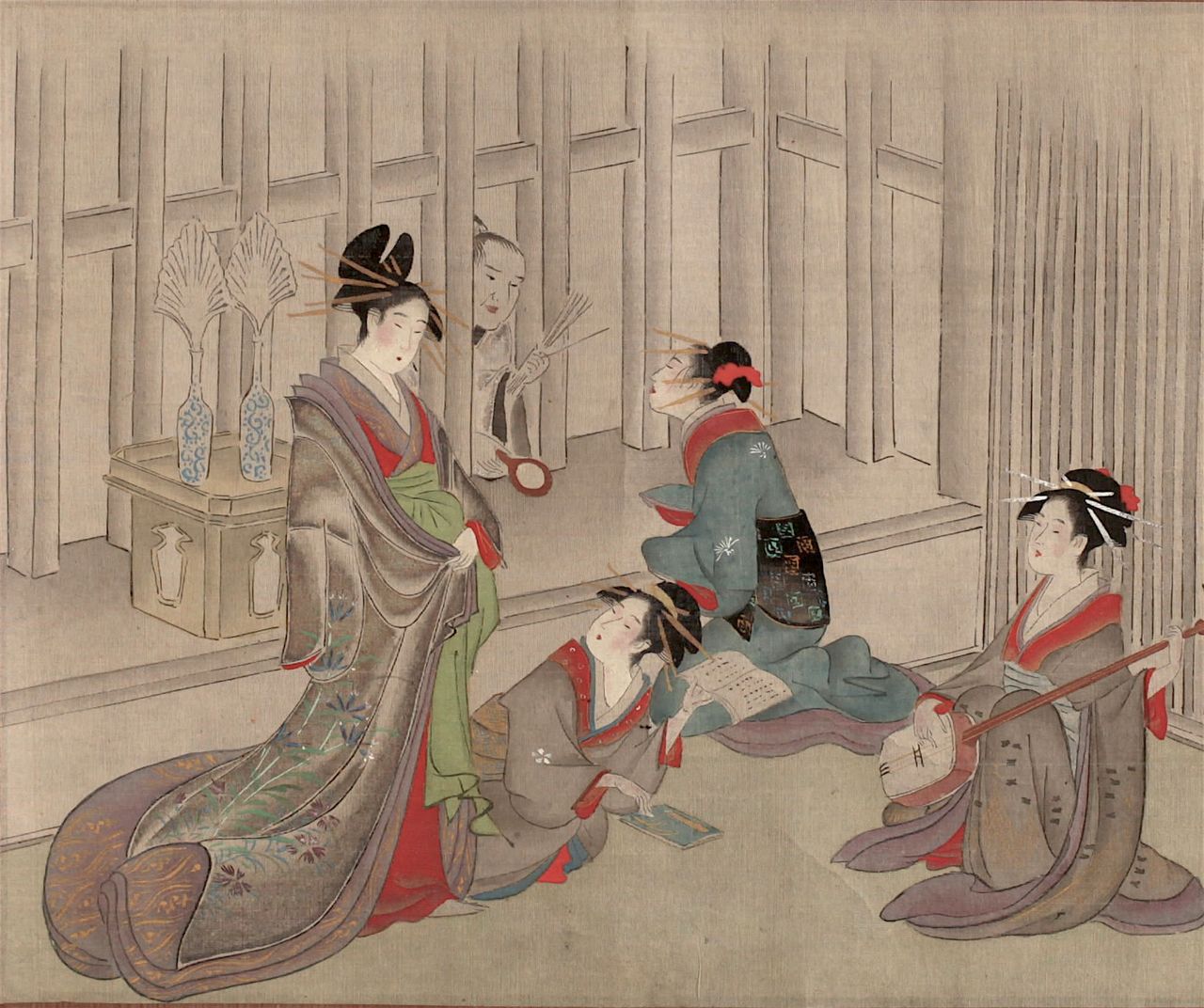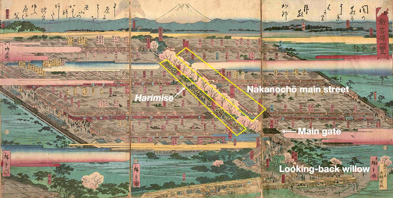 The shinzō sat on display to customers in the harimise, a room on the first floor of the brothel with a lattice front. Harimise were lined up along the main street of Yoshiwara.