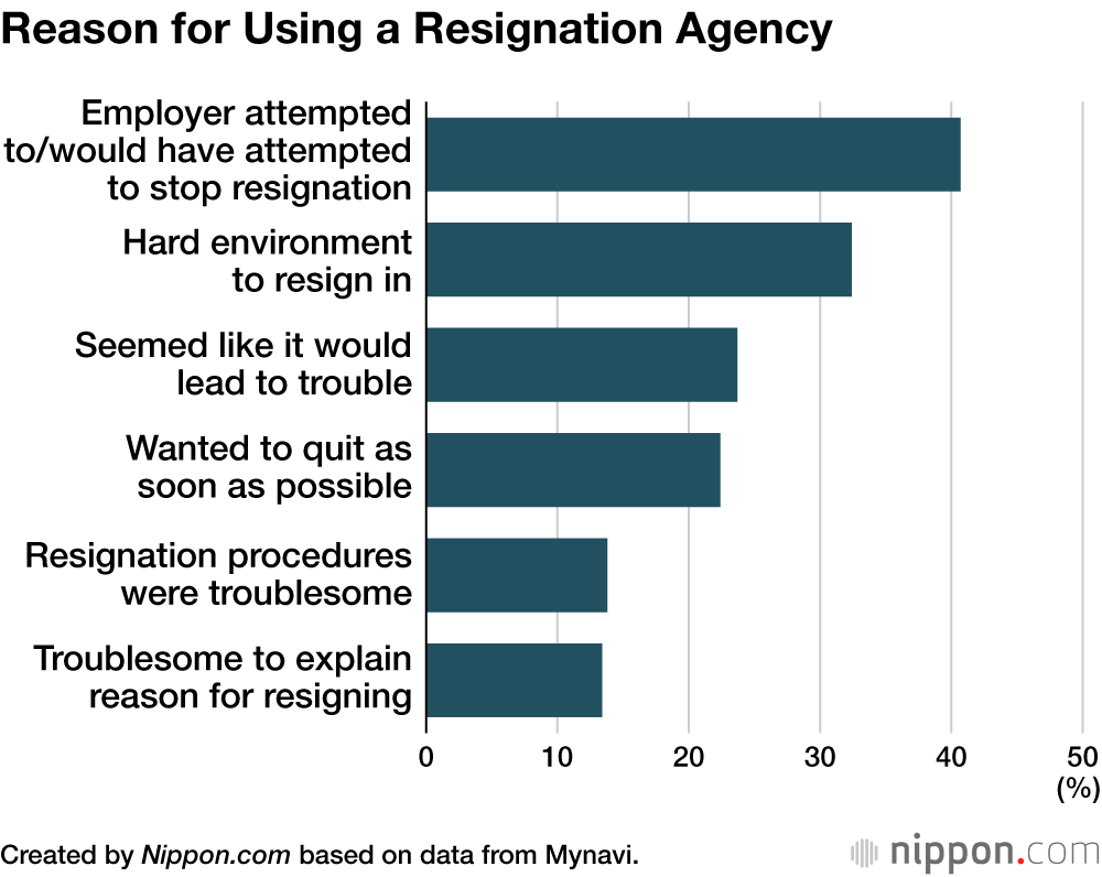 A report released in October 2024 by Mynavi, which runs a job-hunting and career-change platform, found that among 800 respondents (multiple answers allowed), the leading reasons for using a resignation agency were “They tried to stop me from resigning” or “They would have tried to stop me from resigning” (40.7%), followed by “I wasn’t in an environment where I could say I wanted to quit” (32.4%). In interviews conducted by the author, the latter was the reason most frequently encountered.