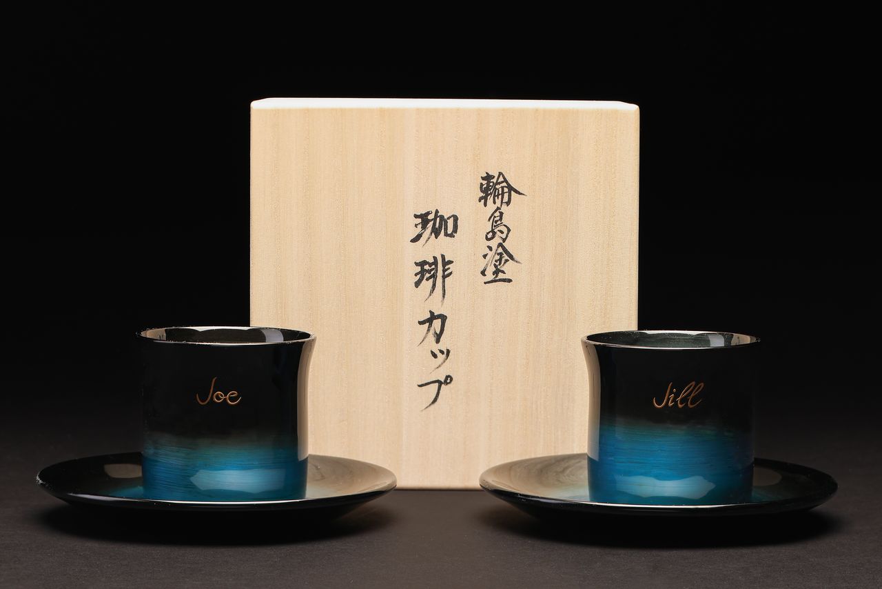 Taya Shikkiten’s wajimanuri coffee cups presented to former US President Joe Biden. (© Taya Shikkiten)