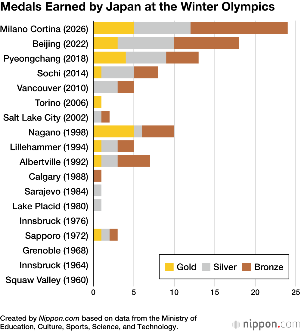 At Milano Cortina 2026, Japan took tenth place overall in the weighted medal count, with 5 gold, 7 silver, and 12 bronze podium finishes. Its 24 medals were an all-time high for the country’s Winter Games squad and placed the country fifth in the straightforward medal count.