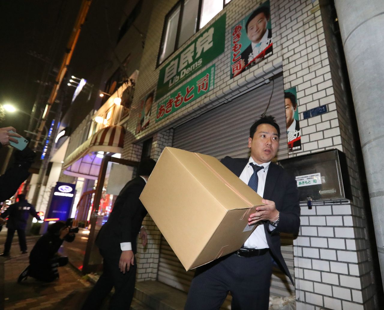 An official from the Tokyo District Public Prosecutors Office carries a box containing confiscated items from the office of House of Representatives member Akimoto Tsukasa in Kōtō, Tokyo, on December 19, 2019. (© Jiji)