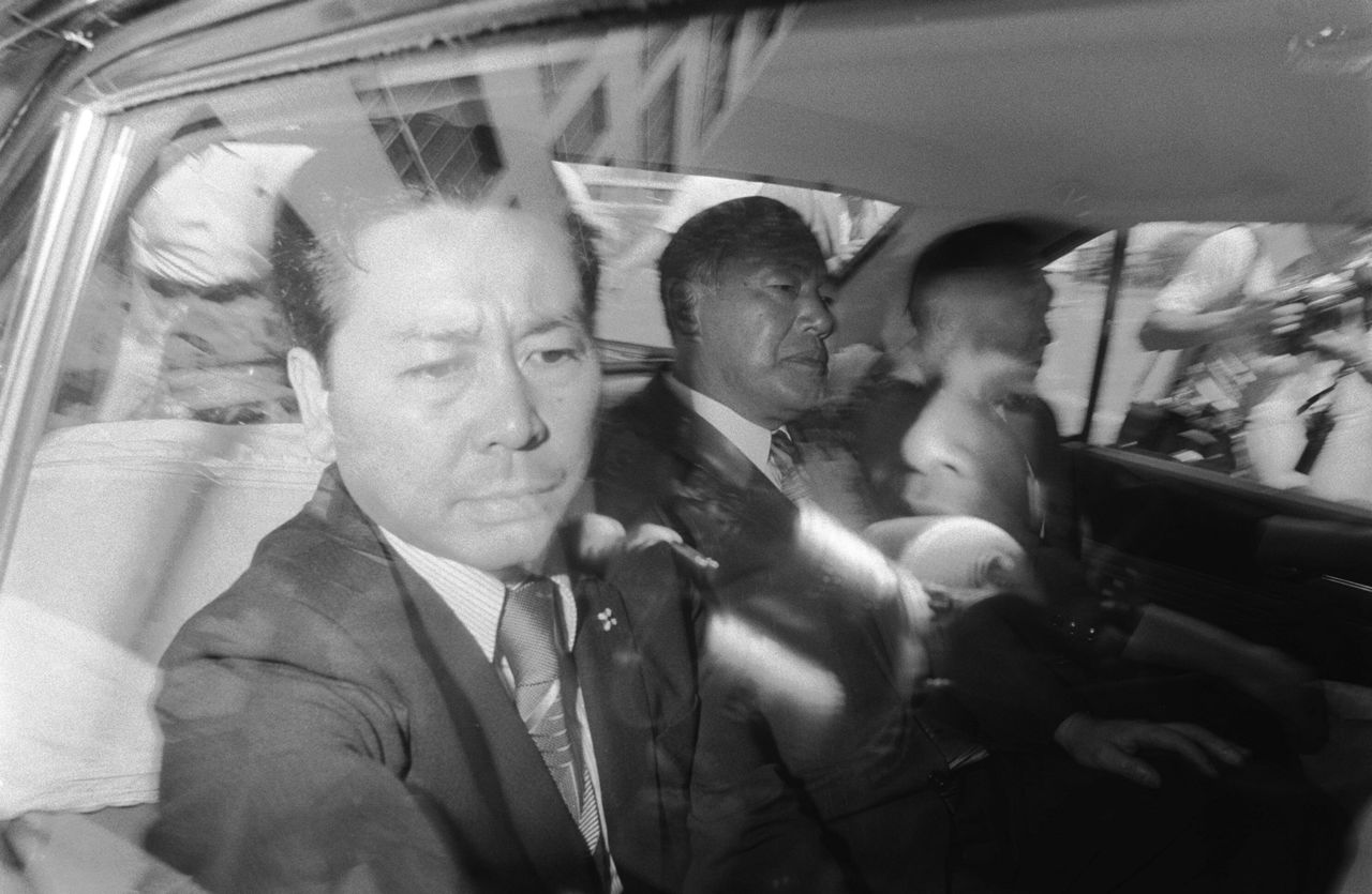 Former Prime Minister Tanaka Kakuei (center) taken to the Tokyo Detention Center on July 27, 1976, following his arrest in the Lockheed scandal. (© Jiji)