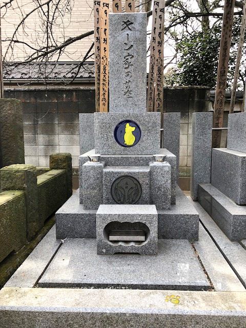 Keene’s family grave, prepared by himself before his death at a temple near his home. As he was born in the year of the dog, he chose a yellow dog as his family crest. It is also a play on words (kiinu) on his surname.