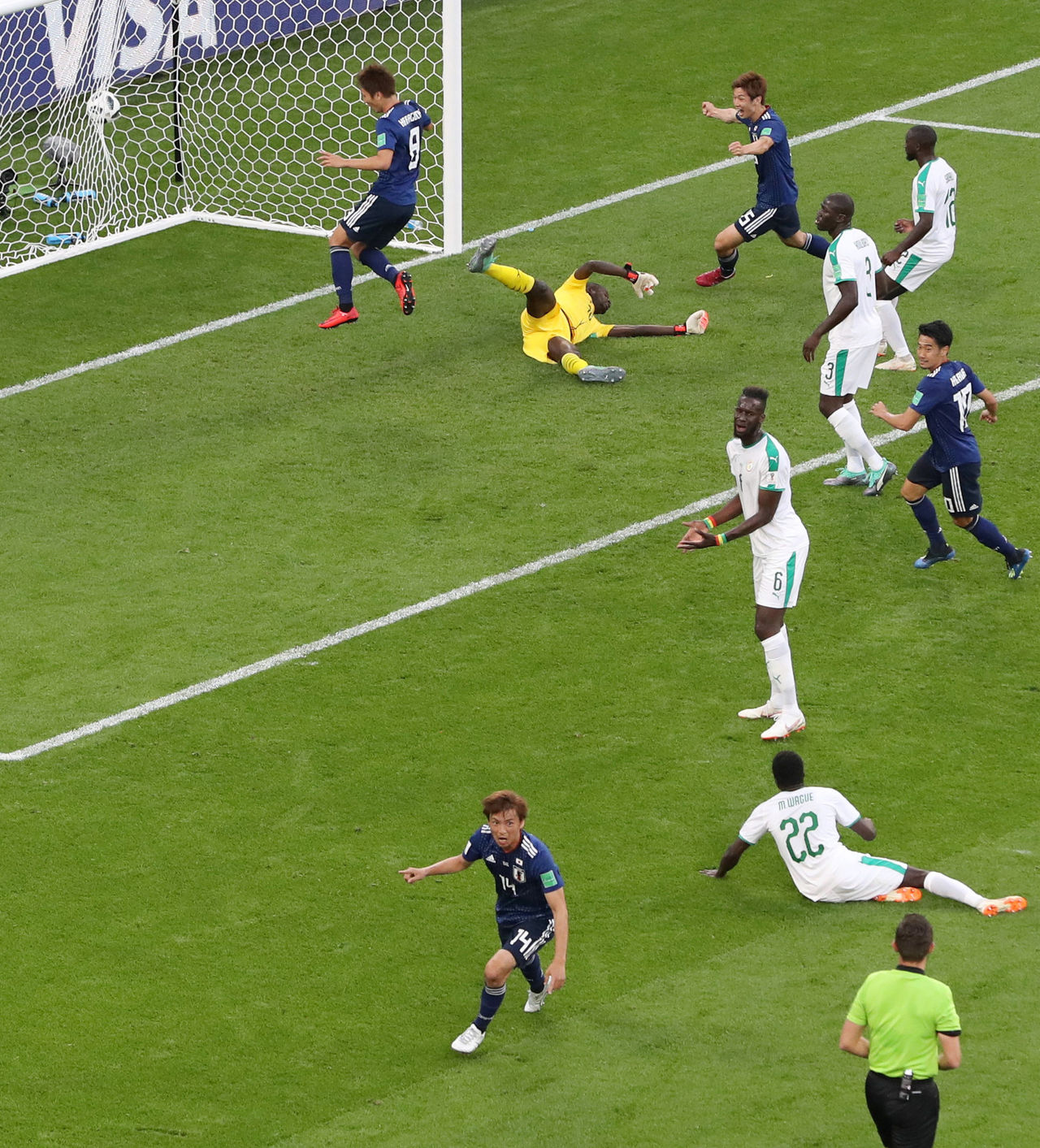 Inui Takashi (bottom center) celebrates his first-half equalizer, a spectacular shot that curled past the outstretched hands of the Senegalese goal keeper Khadim N'Diaye. (© Jiji)