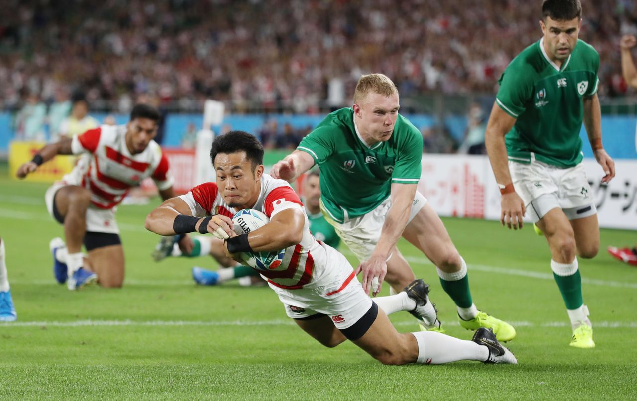 Japan’s Fukuoka Kenki scores a try against Ireland in the second half of the Rugby World Cup Pool A game at Shizuoka Stadium Ecopa on September 28. (© Jiji)