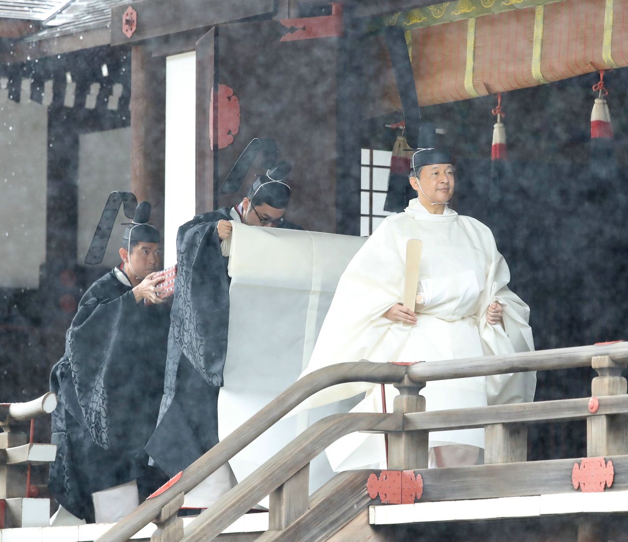 Emperor Naruhito returns to his quarters after taking part in the Sokuirei Tōjitsu Kashiko-dokoro Ōmae no Gi, a ceremony taking place on the morning of his formal enthronement. (© Jiji; pool photo)