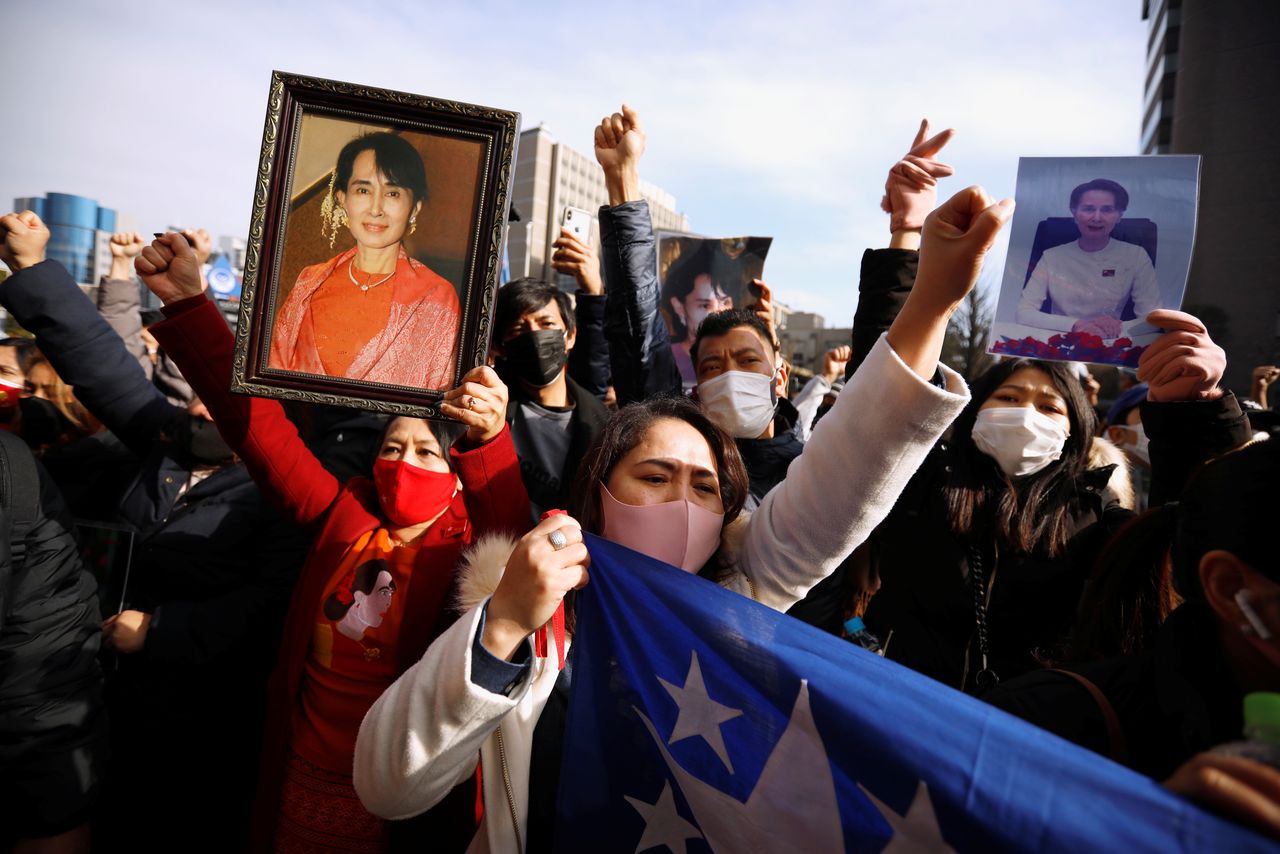Myanmar protesters residing in Japan hold photos of Aung San Suu Kyi as they rally against Myanmar’s military after seizing power from a democratically elected civilian government and arresting its leader Aung San Suu Kyi, at United Nations University in Tokyo, Japan February 1, 2021. REUTERS/Issei Kato