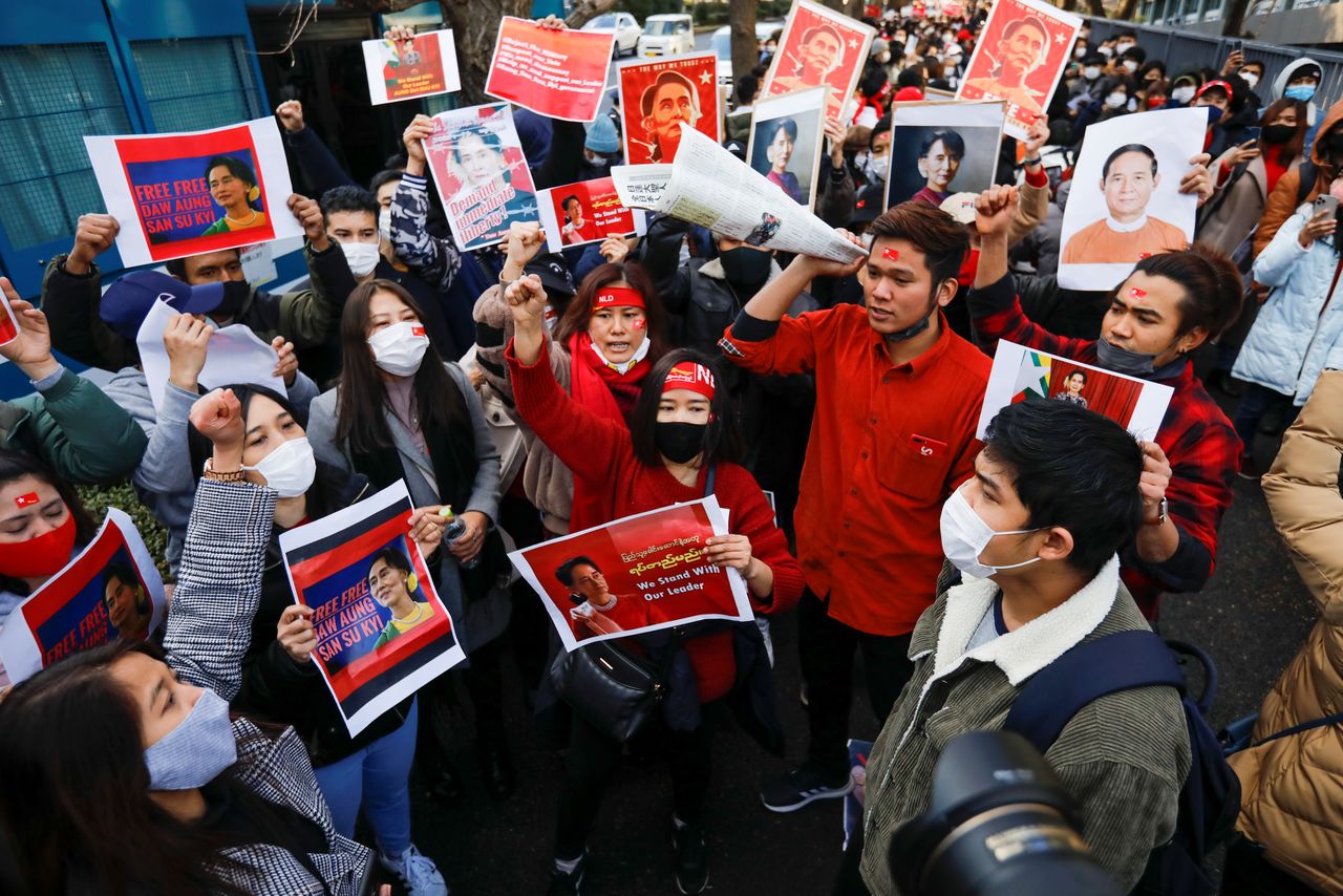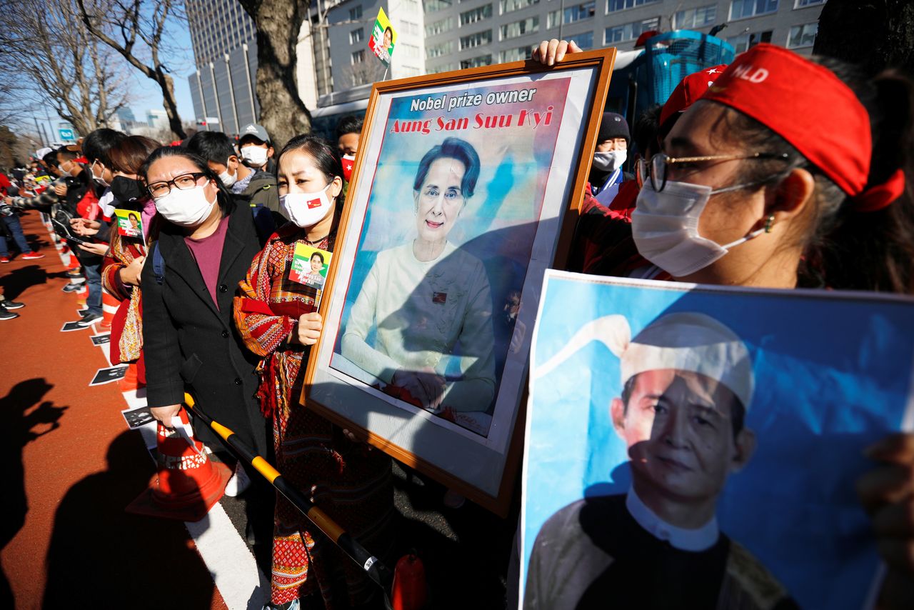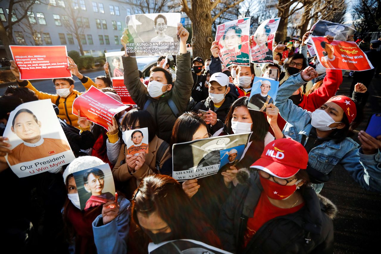 Protesters from Myanmar residing in Japan hold portraits of leader Aung San Suu Kyi and Myanmar’s President Win Myint at a rally against Myanmar’s military after it seized power from a democratically elected civilian government and arrested the duo, outside Foreign Ministry in Tokyo, Japan February 3, 2021. REUTERS/Issei Kato