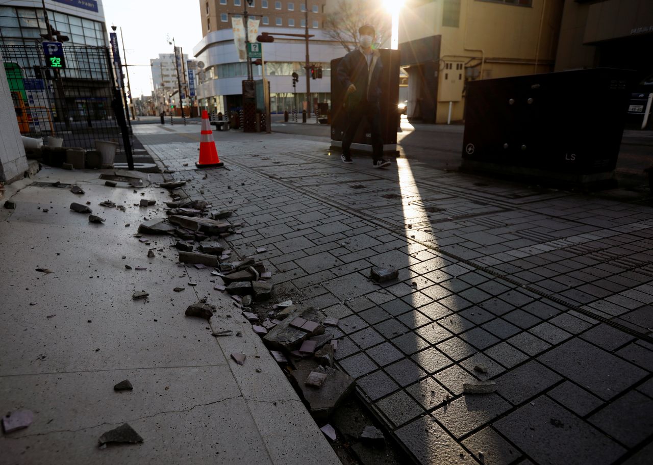 Collapsed exterior wall of a building caused by a strong earthquake are seen on the street in Iwaki, Fukushima prefecture, Japan February 14, 2021. REUTERS/Issei Kato