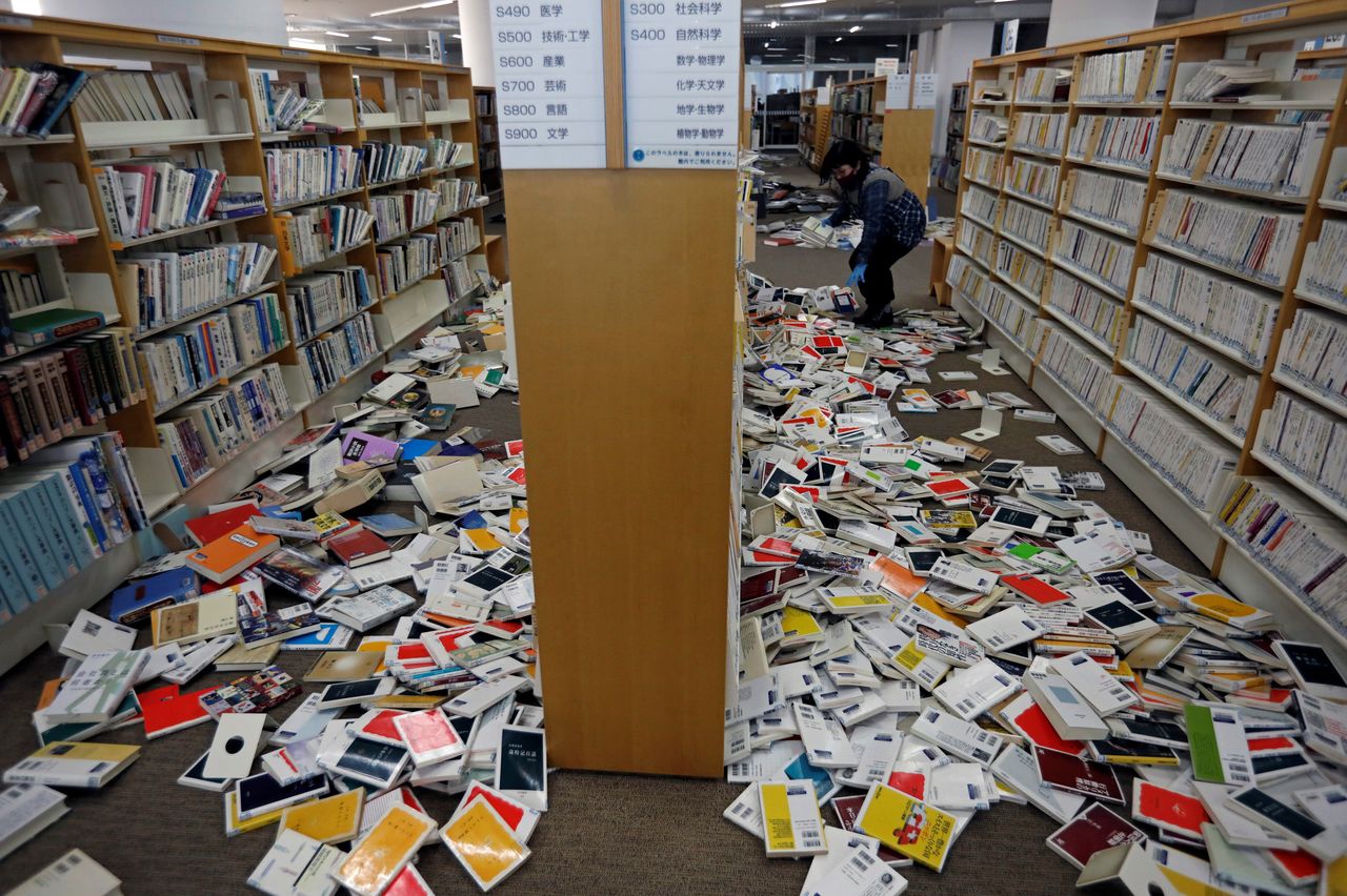 A staff member of library tries to restore books after they fell from book shelves by a strong earthquake at Iwaki City library in Iwaki, Fukushima prefecture, Japan February 14, 2021. REUTERS/Issei Kato