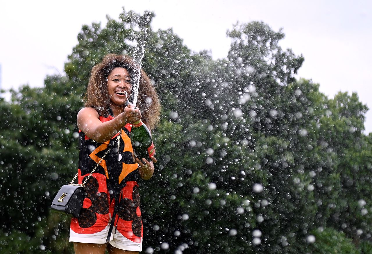 Tennis - Australian Open - Women’s Singles Photo Shoot - Royal Botanic Gardens Victoria, Melbourne, Australia, February 21, 2021 Australian Open champion Japan’s Naomi Osaka celebrates with champagne during a photo shoot at the Royal Botanic Gardens Victoria REUTERS/Jaimi Joy