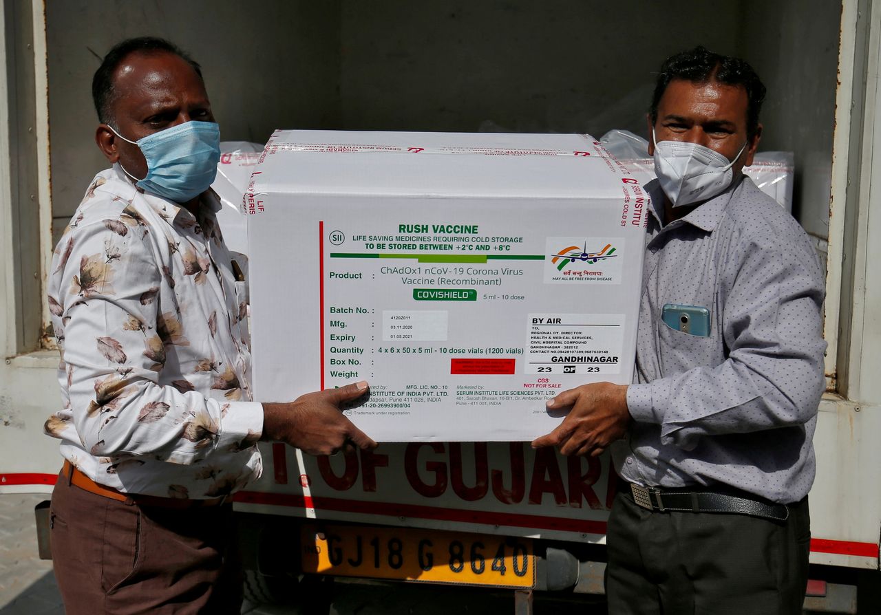 FILE PHOTO: Officials unload boxes containing vials of AstraZeneca’s COVISHIELD, a coronavirus disease (COVID-19) vaccine manufactured by Serum Institute of India, outside a vaccination storage centre in Ahmedabad, India, January 12, 2021. REUTERS/Amit Dave/File Photo
