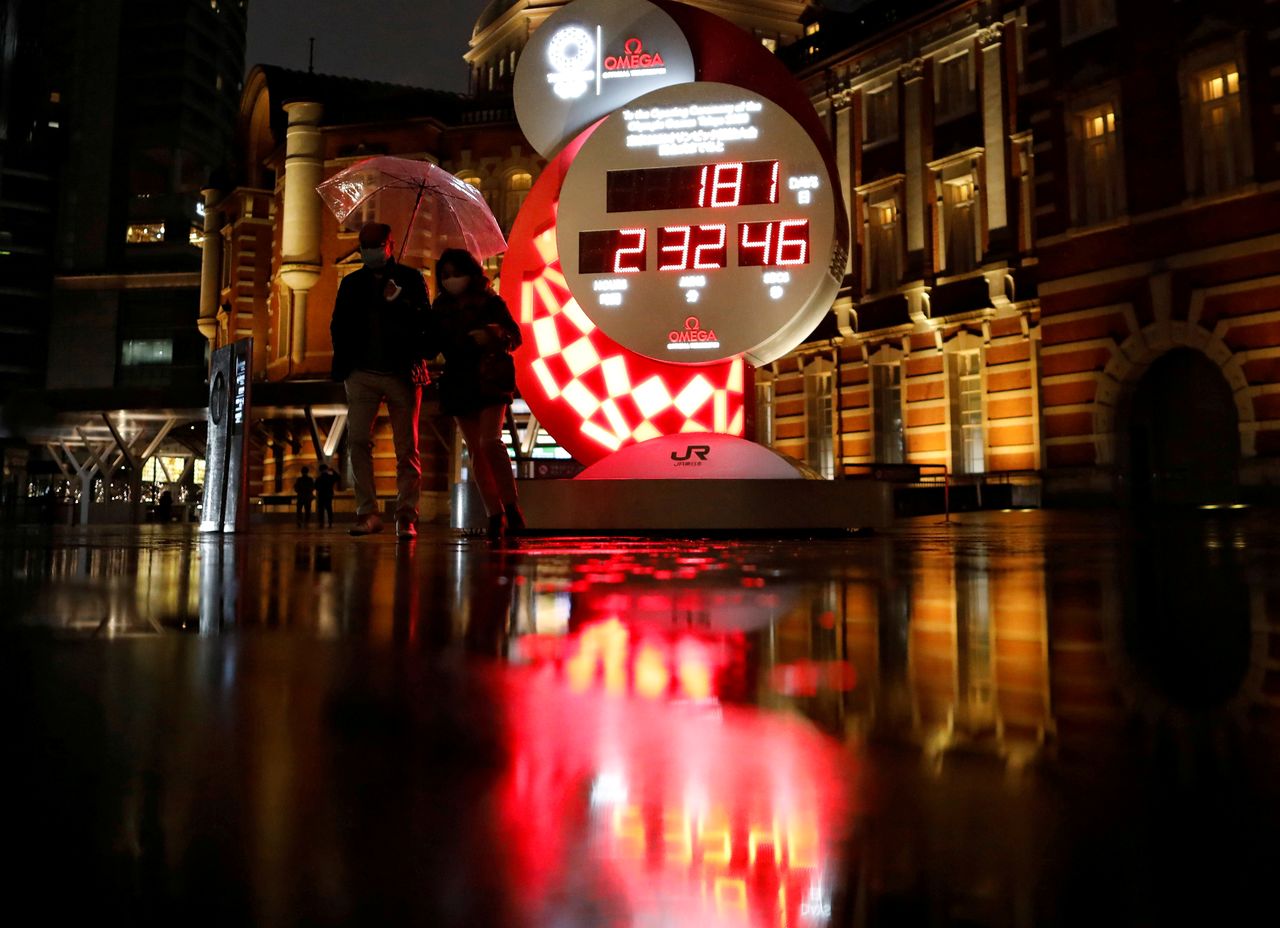 FILE PHOTO: Passersby walk past a countdown clock to the Tokyo 2020 Olympic Games that have been postponed to 2021 due to the coronavirus disease (COVID-19) outbreak, in Tokyo, Japan January 23, 2021. REUTERS/Issei Kato/File Photo