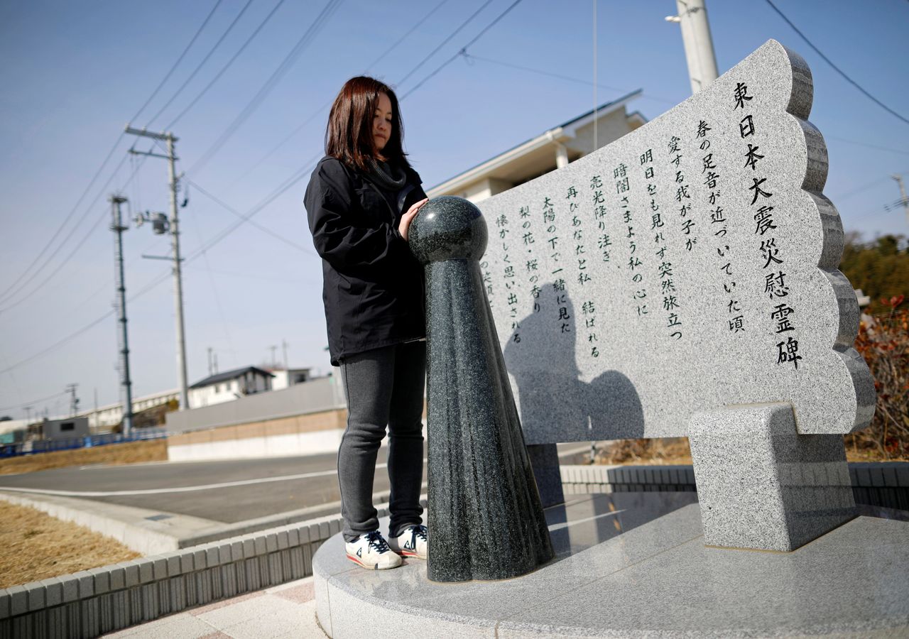 Mika Sato, 46, who lost her daughter Airi in the March 11, 2011, earthquake and tsunami, touches a memorial monument built for Airi and her kindergarten classmates in Ishinomaki, Miyagi prefecture, Japan, March 1, 2021. Picture taken March 1, 2021. REUTERS/Issei Kato