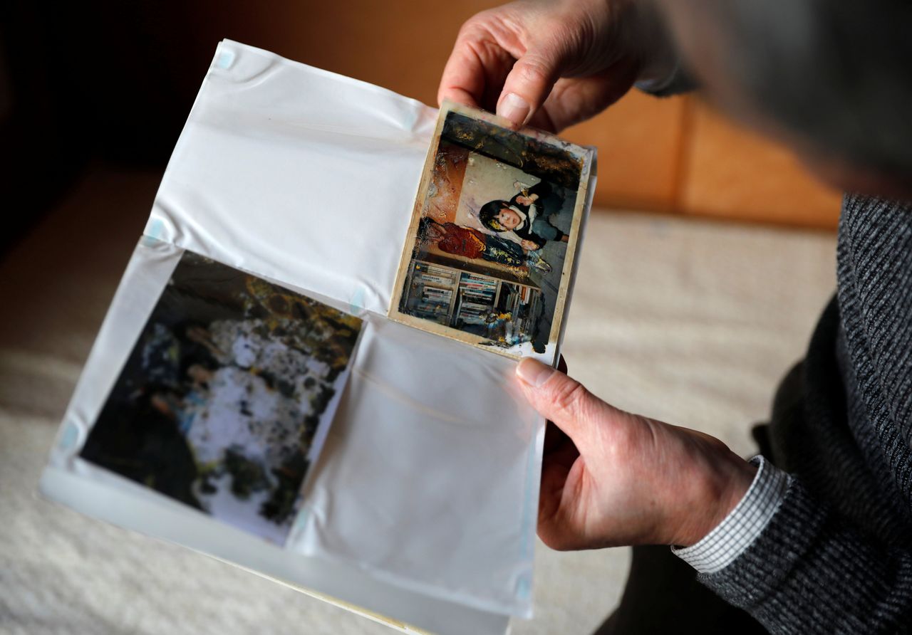 Yoshihito Sasaki, 70, who lost his wife, Mikiko, and his younger son, Jinya, in the March 11, 2011, earthquake and tsunami, looks at photos of his family which was damaged by the disaster and recovered by volunteers at his home in Rikuzentakata, Iwate Prefecture, Japan, February 26, 2021. Picture taken February 26, 2021. REUTERS/Issei Kato NO RESALES. NO ARCHIVES