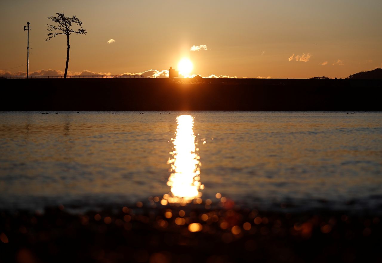 The rising sun and ‘Miracle Pine’, a tree which is said to symbolise hope and recovery after it survived the 2011 tsunami, are seen next to a seawall in Rikuzentakata, Iwate Prefecture, northern Japan February 27, 2021, ahead of the 10th anniversary of the 2011 earthquake and tsunami disaster. Picture taken February 27, 2021. REUTERS/Issei Kato