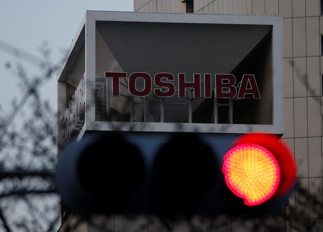 FILE PHOTO: The logo of Toshiba Corp is seen behind a traffic light at the company’s headquarters in Tokyo, Japan March 29, 2017. REUTERS/Issei Kato