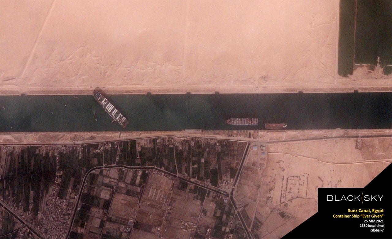 The 400-meter, 224,000-tonne Ever Given container ship, leased by Taiwan’s Evergreen Marine Corp, blocks Egypt’s Suez Canal in a BlackSky satellite image taken at 15:30 local time March 25, 2021. BlackSky/Handout via REUTERS