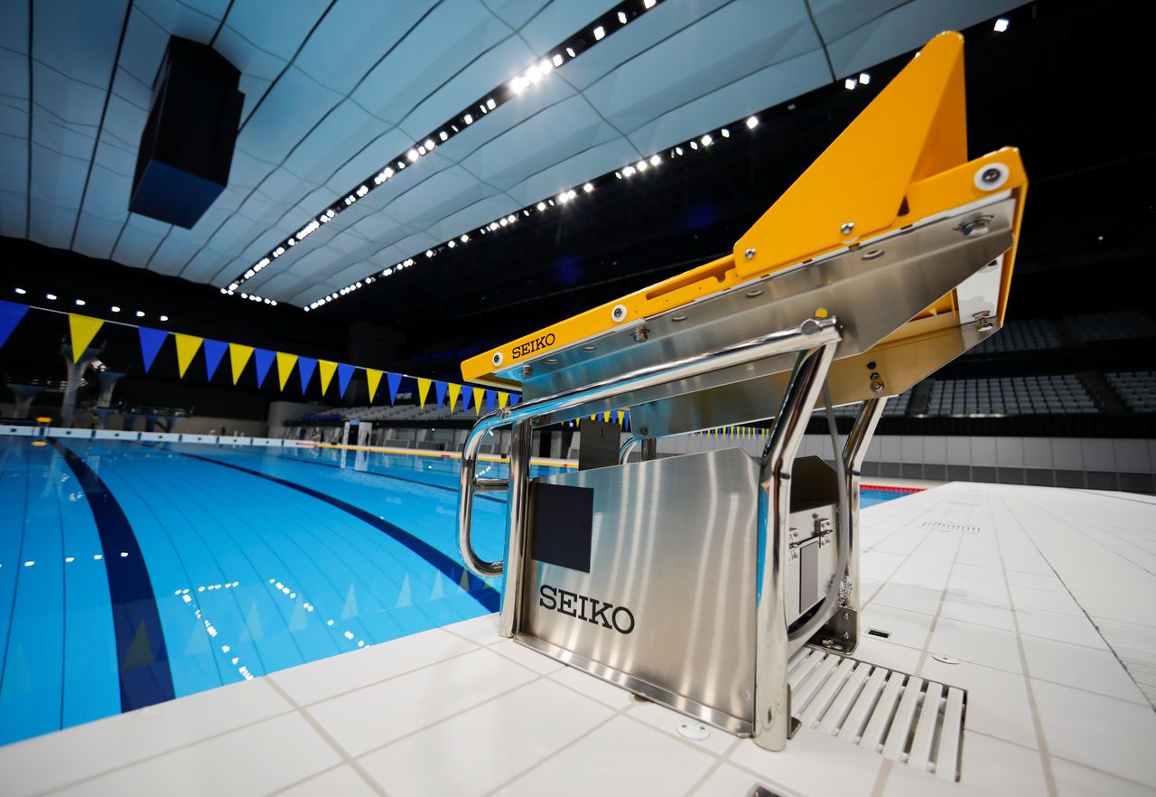 FILE PHOTO: The logos of Seiko are seen at a swimming platform at Tokyo Aquatics Centre, which will host artistic swimming, diving, and swimming events at the Tokyo Olympic and Paralympic games, as the outbreak of the coronavirus disease (COVID-19) continues, after the grand opening ceremony in Tokyo, Japan October 24, 2020. REUTERS/Issei Kato