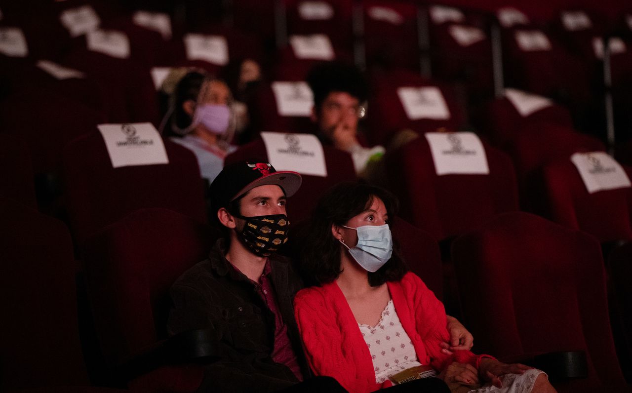 FILE PHOTO: Moviegoers sit socially distanced as they wait for the movie “Godzilla vs. Kong” on the reopening day of the TCL Chinese theatre during the outbreak of the coronavirus disease (COVID-19), in Los Angeles, California, U.S., March 31, 2021. REUTERS/Mario Anzuoni