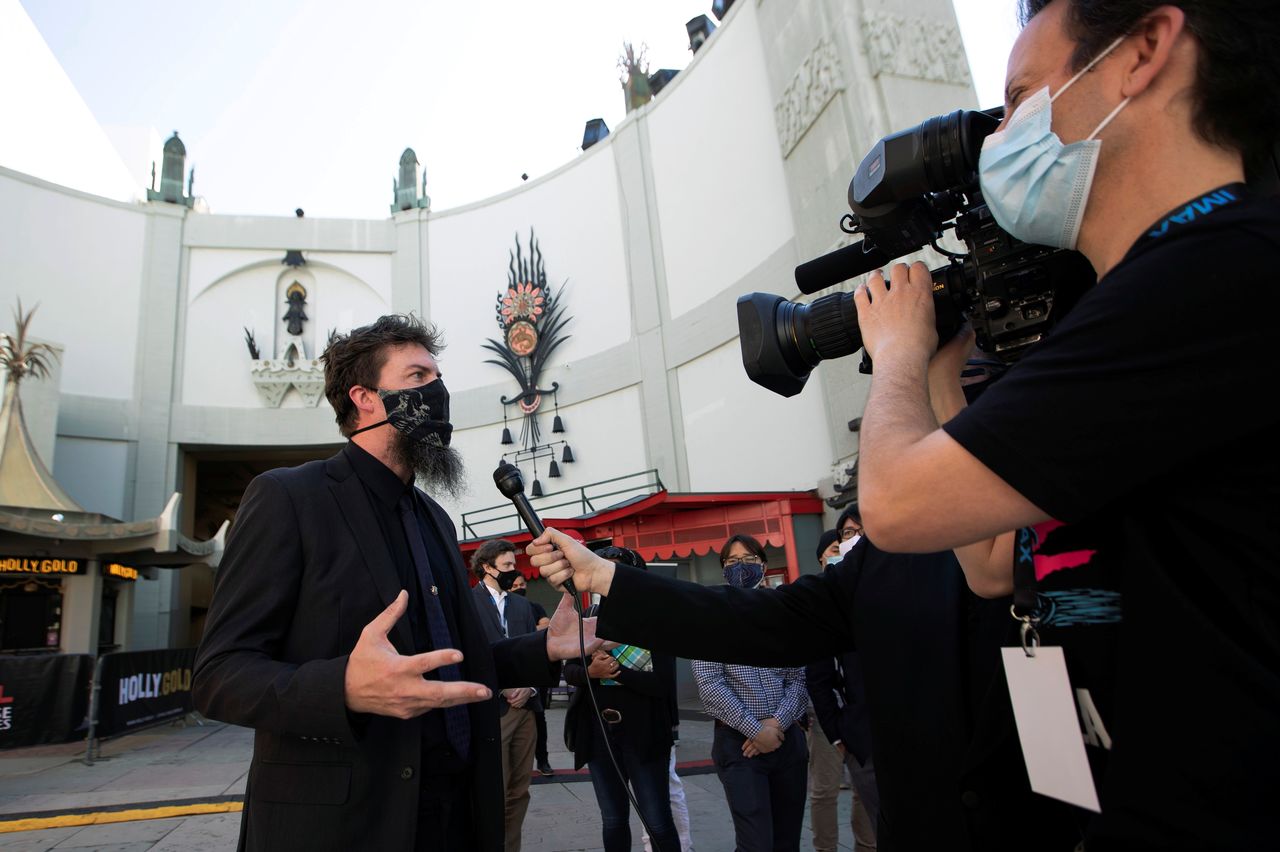 FILE PHOTO: Adam Wingard, director of the upcoming movie “Godzilla vs. Kong”, is interviewed at a ribbon cutting ceremony ahead of the reopening of the TCL Chinese theatre during the outbreak of the coronavirus disease (COVID-19), in Los Angeles, California, U.S., March 29, 2021. REUTERS/Mario Anzuoni
