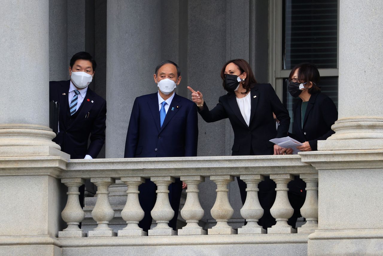 U.S. Vice President Kamala Harris and Japan?s Prime Minister Yoshihide Suga speak on a balcony at the Eisenhower Executive Office Building following a meeting at the White House in Washington, U.S., April 16, 2021. REUTERS/Tom Brenner