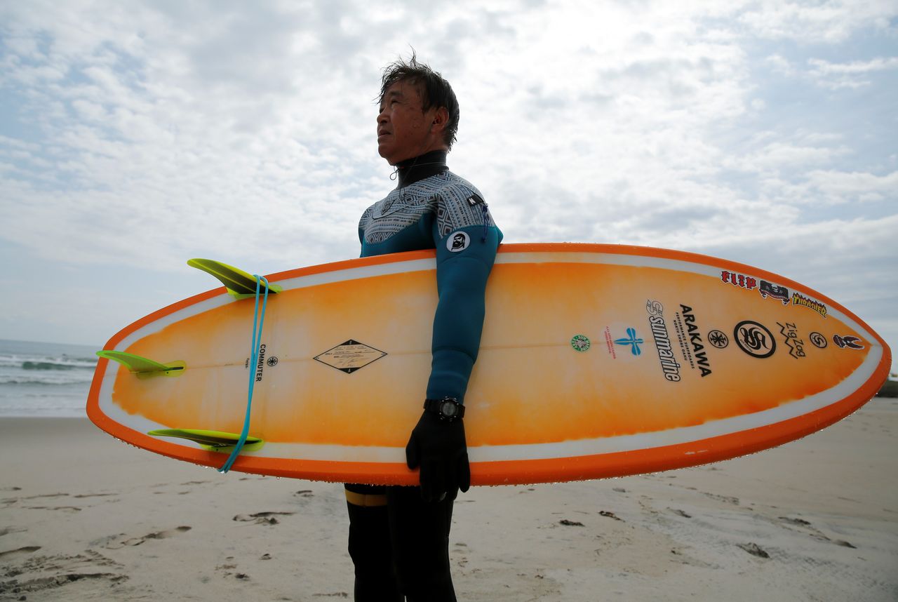 Koji Suzuki, 66, a surfer and a surf shop owner, holds his surfboard at Karasuzaki beach, around 30 kilometres (20 miles) north of the tsunami-crippled Fukushima Daiichi Nuclear Power Plant, in Minamisoma, Fukushima Prefecture, Japan, April 16, 2021. REUTERS/Akira Tomoshige