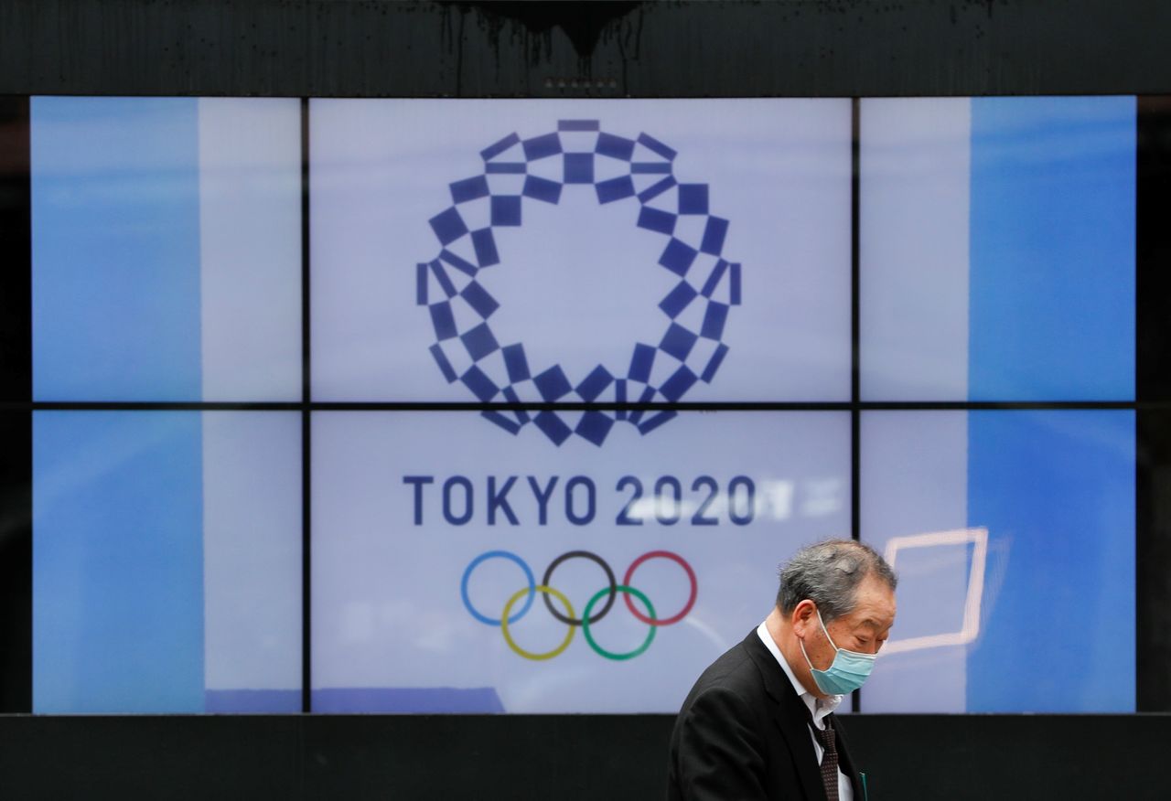 A passerby wearing a protective face mask walks past a screen showing the logo of the Tokyo 2020 Olympic Games that have been postponed to 2021 due to the coronavirus disease (COVID-19) pandemic, in Tokyo, Japan, April 14, 2021. REUTERS/Issei Kato