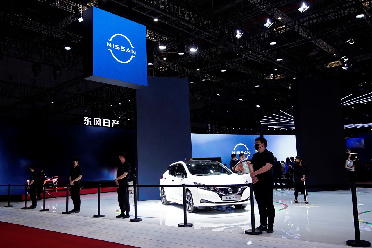 Staff members stand near a Nissan Leaf electric vehicle (EV) displayed at the Nissan booth during a media day for the Auto Shanghai show in Shanghai, China April 19, 2021. REUTERS/Aly Song