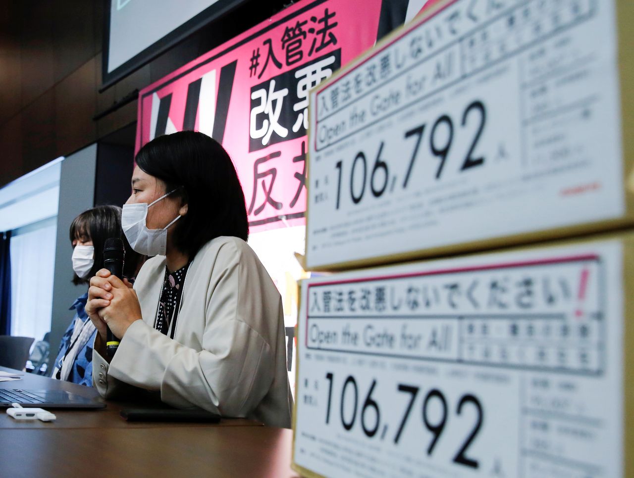 Activists attend a news conference on Japan's revised immigration law bill in Tokyo, Japan April 22, 2021. REUTERS/Akira Tomoshige