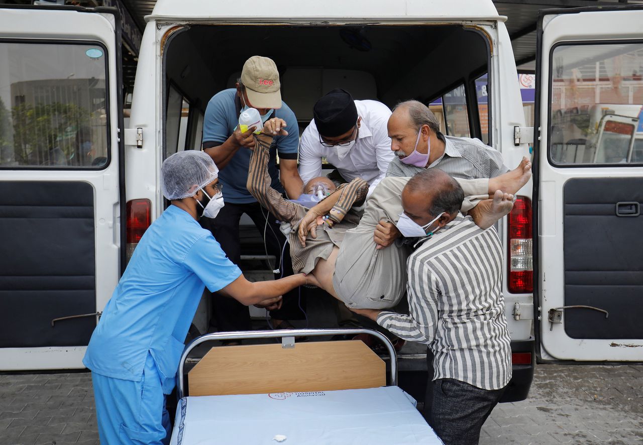 Healthcare workers and relatives carry Shashikantbhai Parekh, a patient with breathing problem, out from an ambulance for treatment at a COVID-19 hospital, amidst the spread of the coronavirus disease (COVID-19) in Ahmedabad, India, April 28, 2021. REUTERS/Amit Dave