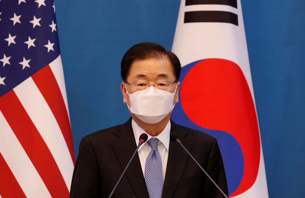 FILE PHOTO: South Korean Foreign Minister Chung Eui-yong speaks during a joint news conference after the Foreign and Defense Ministerial meeting between South Korea and the U.S. at the Foreign Ministry in Seoul, South Korea, March 18, 2021. Lee Jin-man/Pool via REUTERS