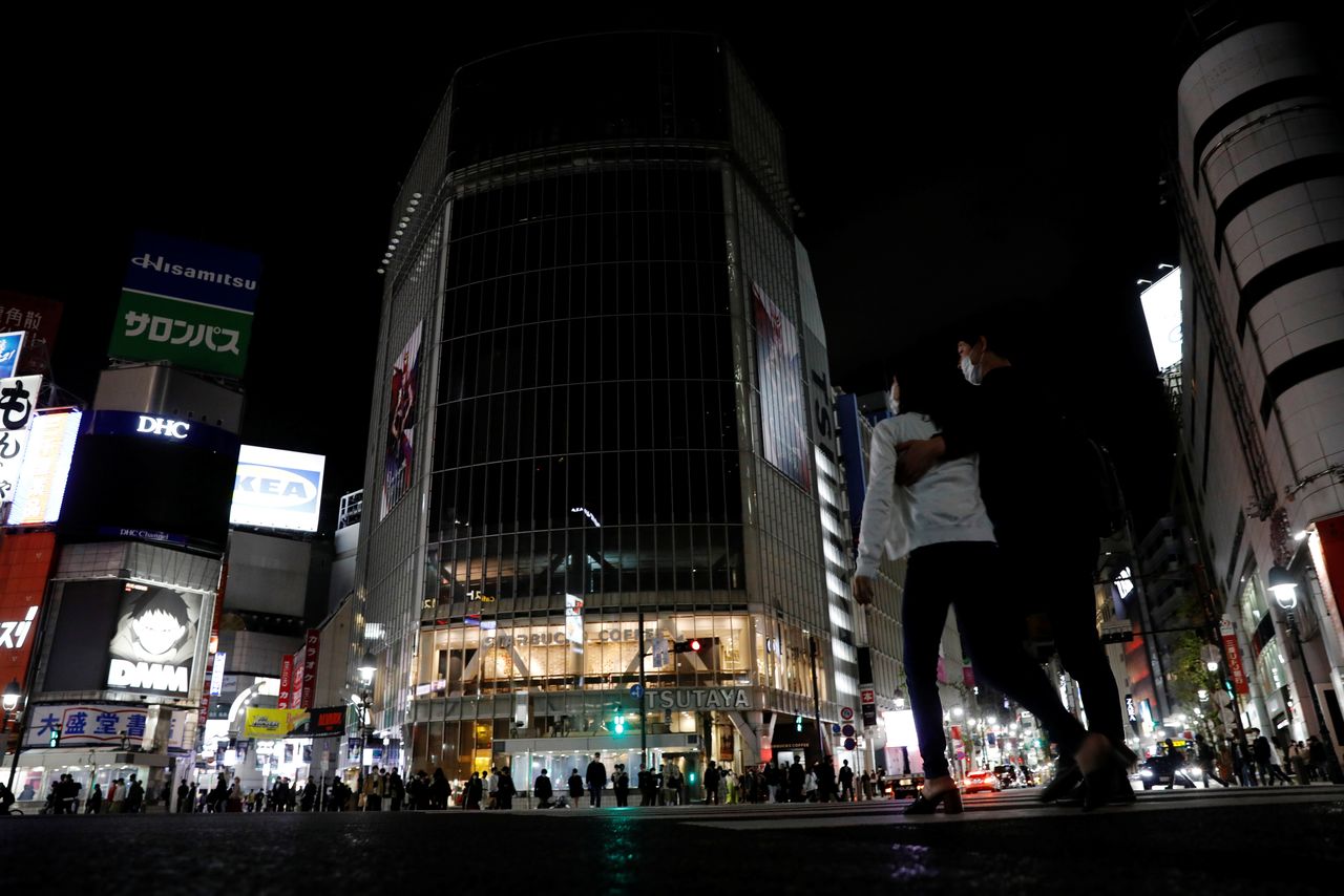 FILE PHOTO: A couple wearing protective face masks make their way at Shibuya crossing, where some of neon signs are turned off after 8 PM, on the first day of the country's third state of emergency, amid the coronavirus disease (COVID-19) outbreak, in Tokyo, Japan, April 25, 2021. REUTERS/Kim Kyung-Hoon