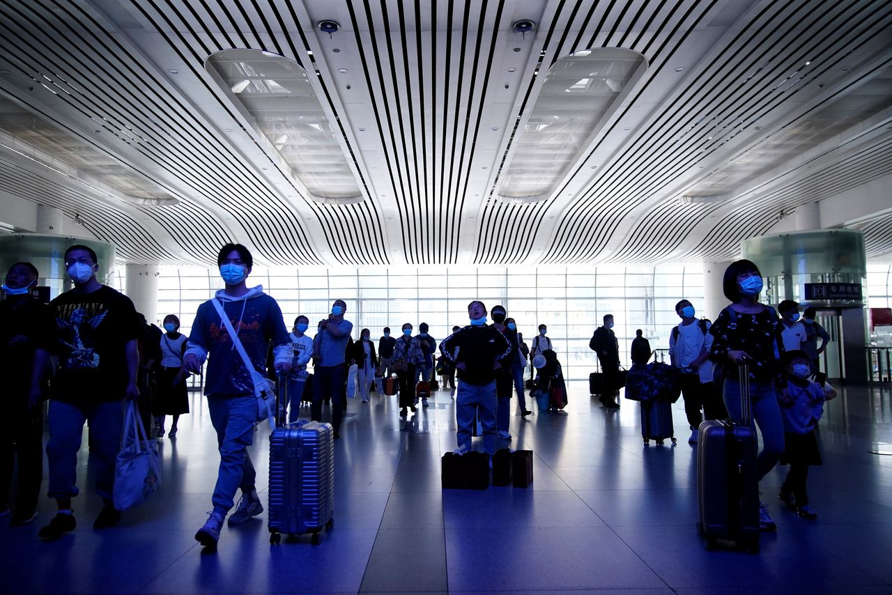 People wearing masks are seen arriving at Shanghai railway station in Shanghai, ahead of the 5-day Labor Day holidays, in China April 30, 2021. REUTERS/Aly Song