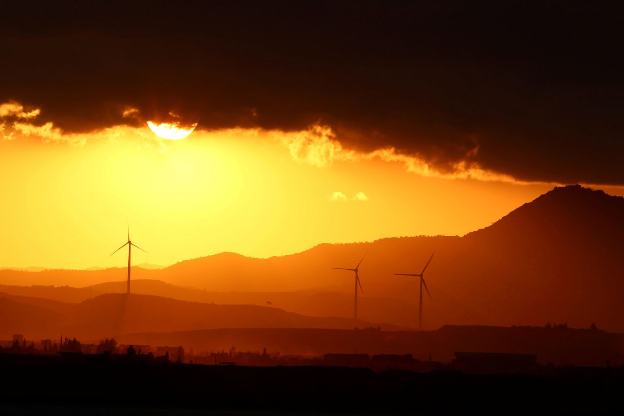 FILE PHOTO: Power-generating windmill turbines are pictured during the sunset near Larnaca, Cyprus September 30, 2017. REUTERS/Yiannis Kourtoglou