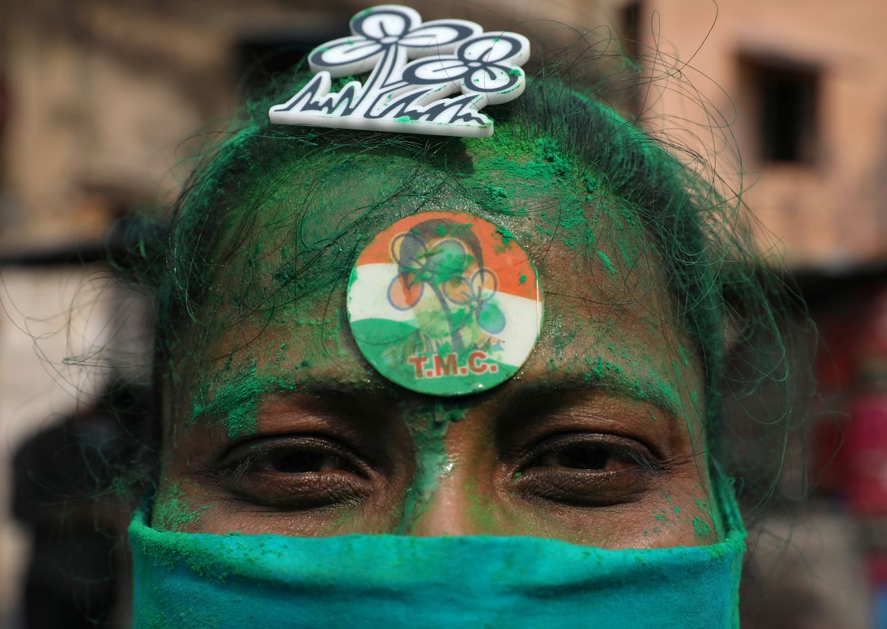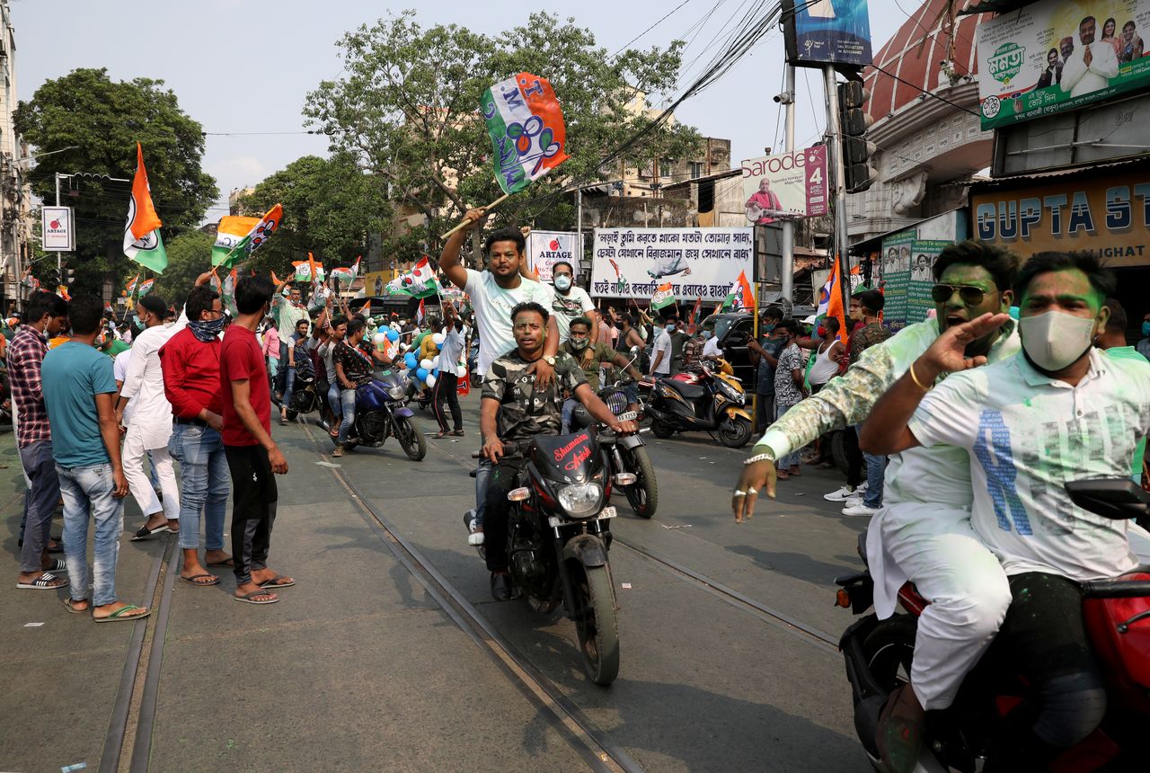 Supporters of Chief Minister of West Bengal state and the Chief of Trinamool Congress (TMC) Mamata Banerjee celebrate after the initial poll results, amidst the spread of the coronavirus disease (COVID-19), in Kolkata, India, May 2, 2021. REUTERS/Rupak De Chowdhuri