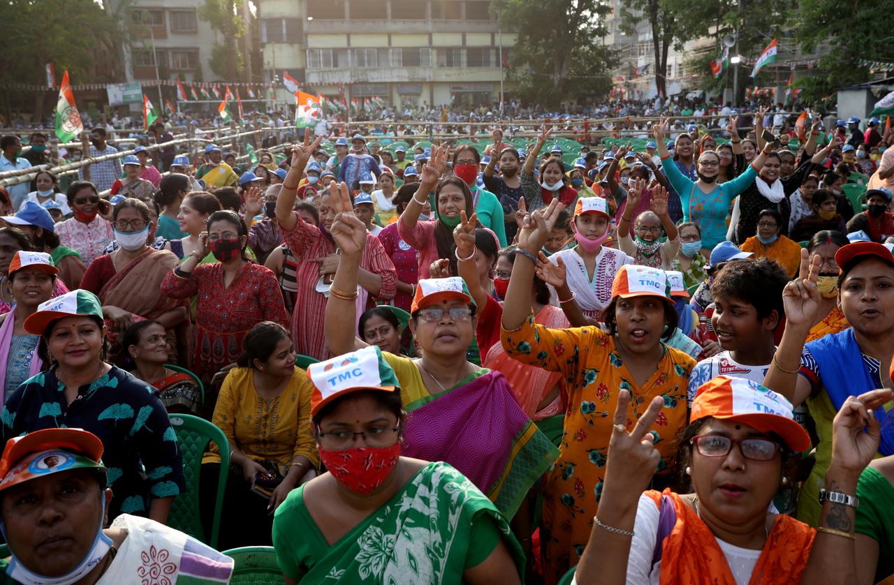 FILE PHOTO: Supporters of the Chief Minister of the eastern state of West Bengal and Trinamool Congress (TMC) Chief, Mamata Banerjee, attend an election campaign rally ahead of the forth phase of the state election, amidst the spread of the coronavirus disease (COVID-19), in Kolkata, India, April 7, 2021. Picture taken April 7, 2021. REUTERS/Rupak De Chowdhuri/File Photo