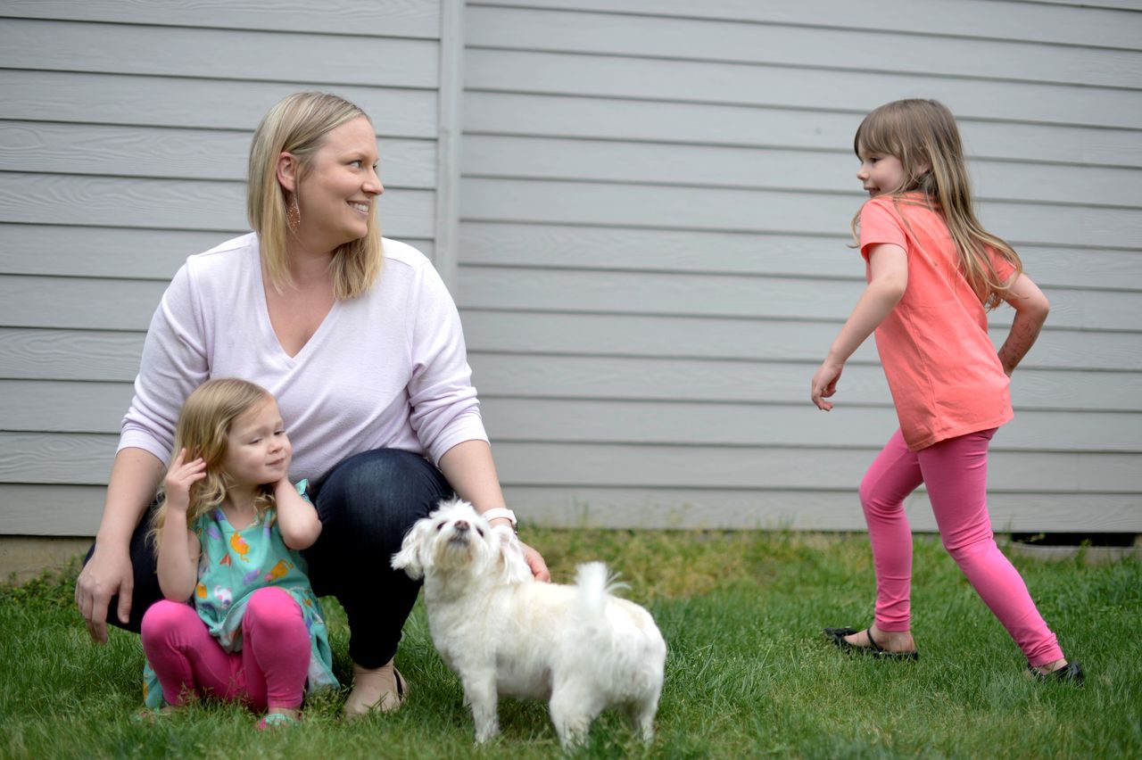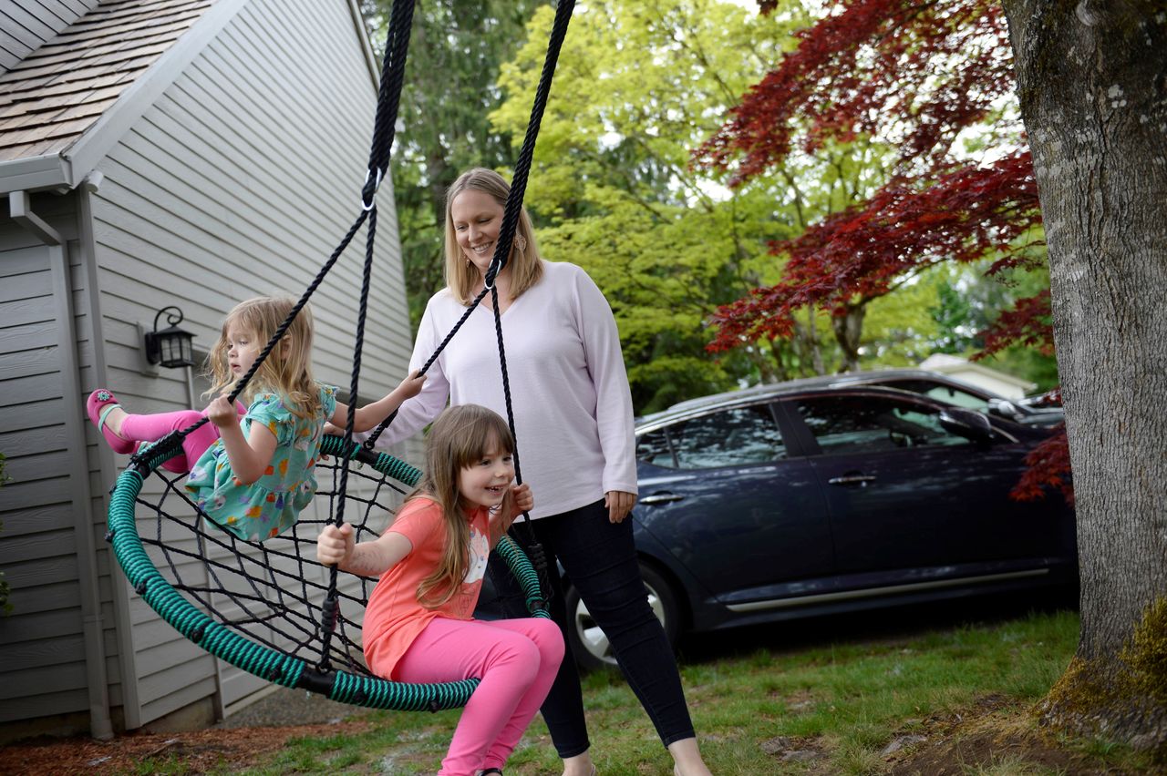 Mother of two, Wendy Niculescu, plays with her daughters Eleanor and Olivia, right in Tigard, Oregon, U.S., May 1, 2021. REUTERS/Amanda Lucier