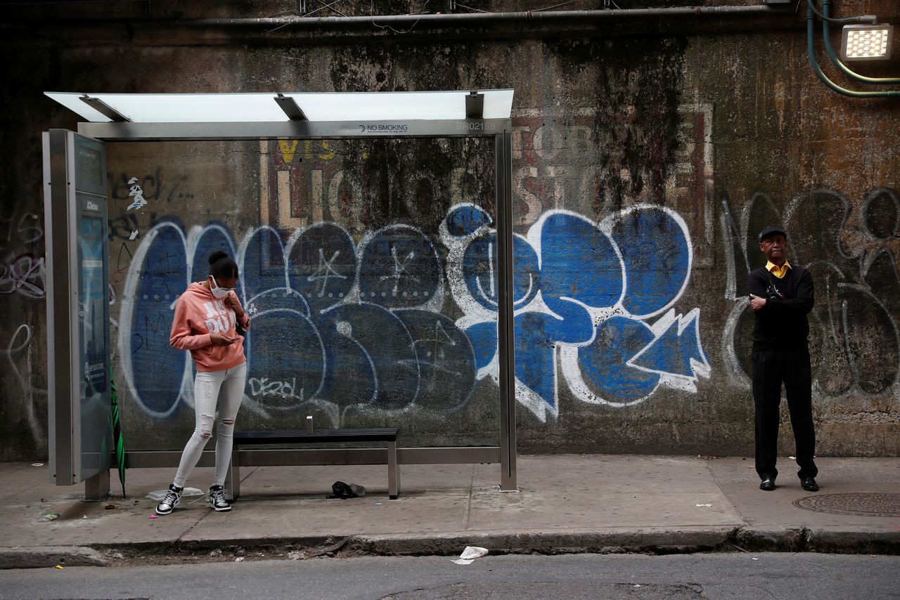 FILE PHOTO: A woman, wearing a protective mask, stands next to a man not wearing one, while waiting for public transportation in the Brownsville section of the Brooklyn borough of New York City, U.S., May 3, 2021. REUTERS/Shannon Stapleton