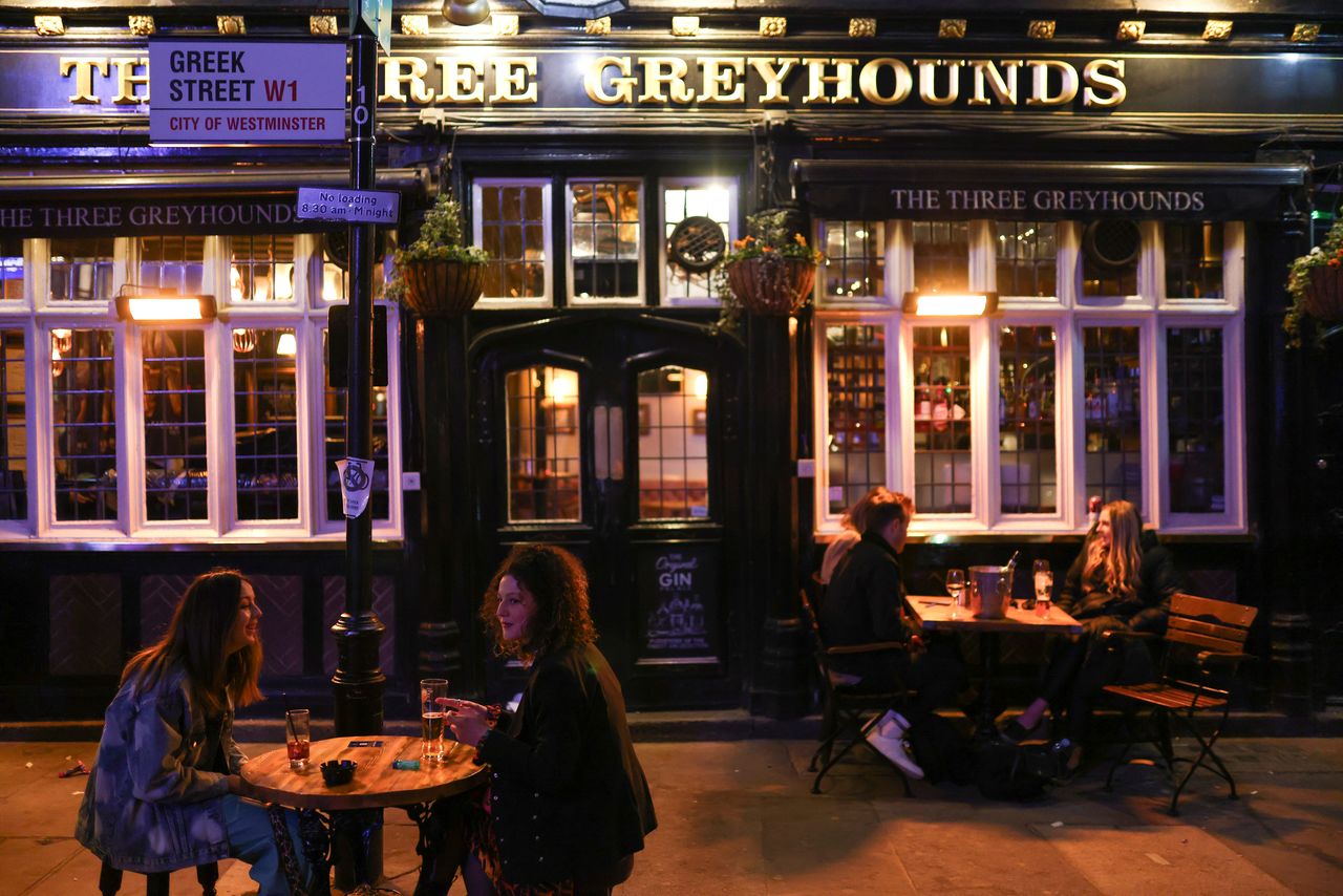 FILE PHOTO: People drink at tables outside a pub in Soho amid the coronavirus disease (COVID-19) outbreak, in London, Britain, April 17, 2021. REUTERS/Tom Nicholson