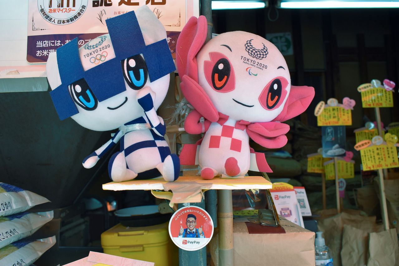 Tokyo 2020 mascots and a PayPay app sticker are displayed at the rice dealer's shop Mikawaya, in Tokyo, Japan June 7, 2021. REUTERS/Sam Nussey