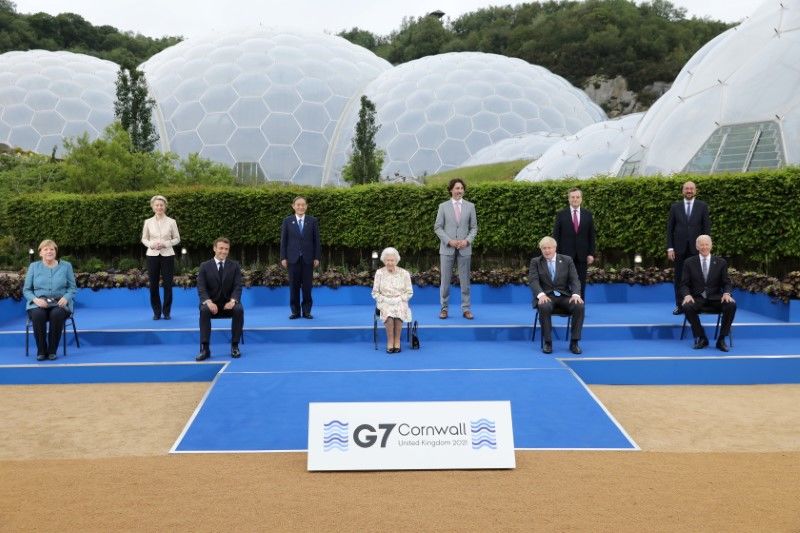 European Commission President Ursula von der Leyen, German Chancellor Angela Merkel, Japan's Prime Minister Yoshihide Suga, France's President Emmanuel Macron along with Britain's Queen Elizabeth, Canada's Prime Minister Justin Trudeau, Britain's Prime Minister Boris Johnson, Italy's Prime Minister Mario Draghi, U.S. President Joe Biden and European Council President Charles Michel pose for a group photo during a drinks reception on the sidelines of the G7 summit, at the Eden Project in Cornwall, Britain June 11, 2021. Jack Hill/Pool via REUTERS