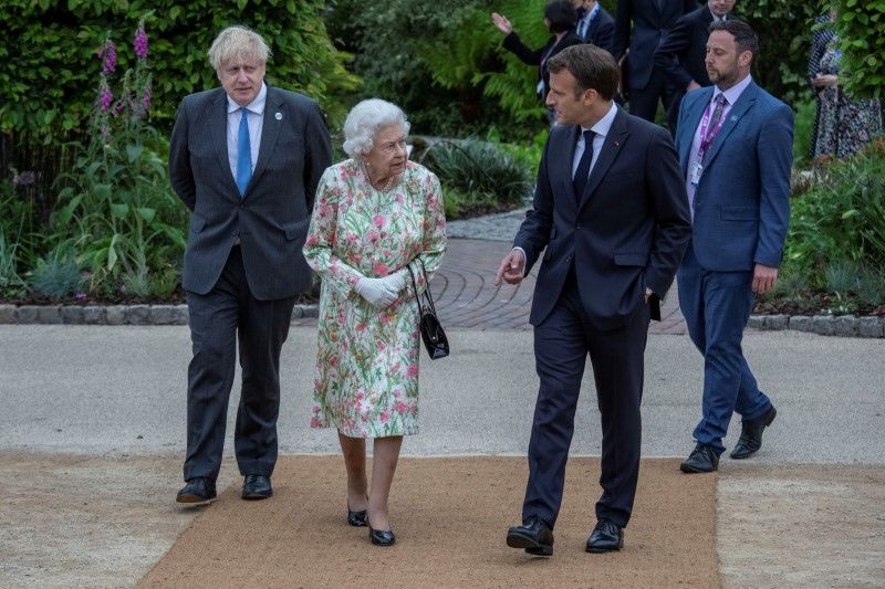 Britain's Queen Elizabeth, Britain's Prime Minister Boris Johnson and France's President Emmanuel Macron attend a drinks reception on the sidelines of the G7 summit, at the Eden Project in Cornwall, Britain June 11, 2021. Jack Hill/Pool via REUTERS
