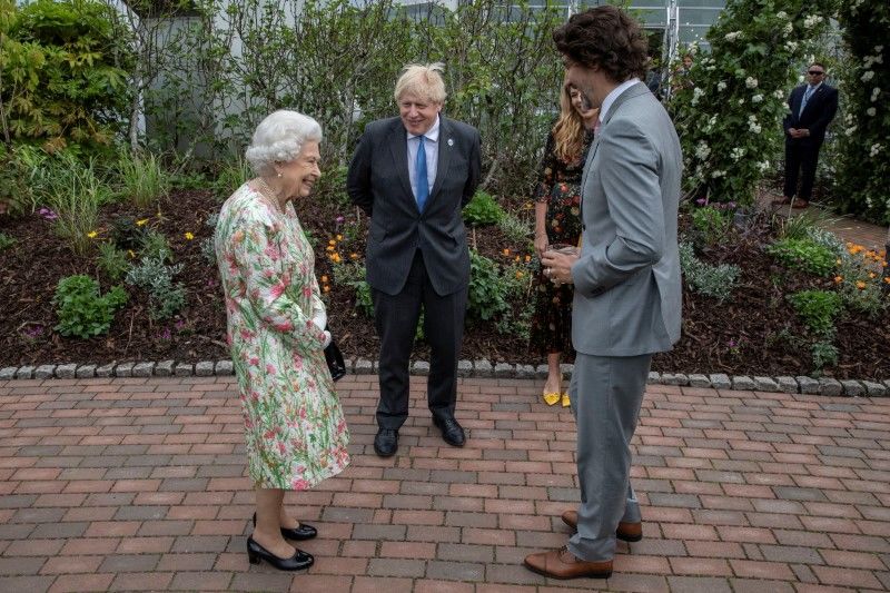 Britain's Queen Elizabeth, Canada's Prime Minister Justin Trudeau and Britain's Prime Minister Boris Johnson attend a drinks reception on the sidelines of the G7 summit, at the Eden Project in Cornwall, Britain June 11, 2021. Jack Hill/Pool via REUTERS