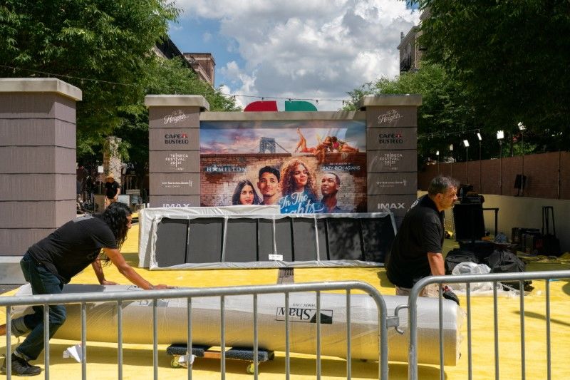 FILE PHOTO: Staffs walk past 'In The Heights' poster outside the United Palace Theatre in the Washington Heights neighborhood in Manhattan, New York, U.S., June 9, 2021. REUTERS/Jeenah Moon
