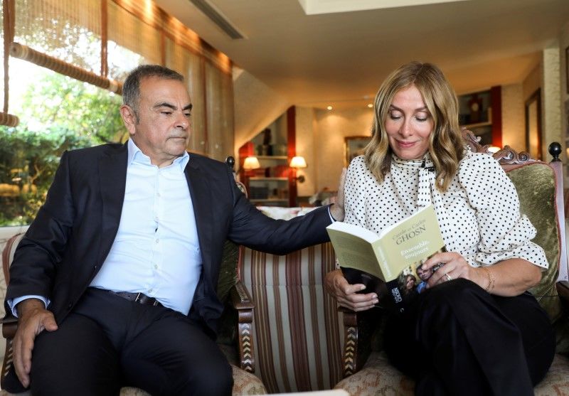 Fugitive former car executive Carlos Ghosn, and his wife Carole Ghosn, talk during an interview with Reuters in Beirut, Lebanon June 14, 2021. REUTERS/Mohamed Azakir