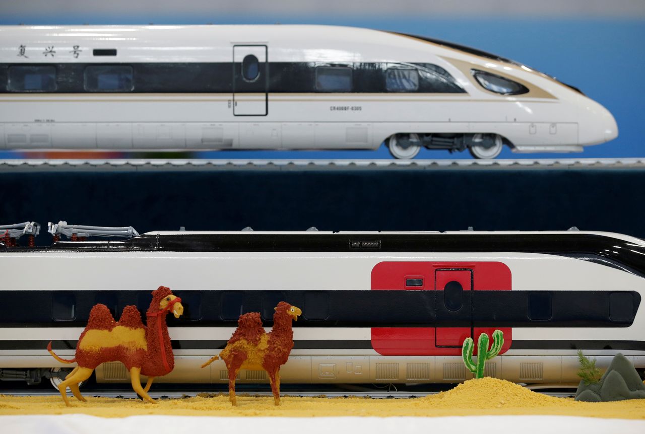 FILE PHOTO: A replica of China Railway High-speed trains is seen at a media center for the second Belt and Road Forum, in Beijing, China, April 26, 2019. REUTERS/Jason Lee/File Photo