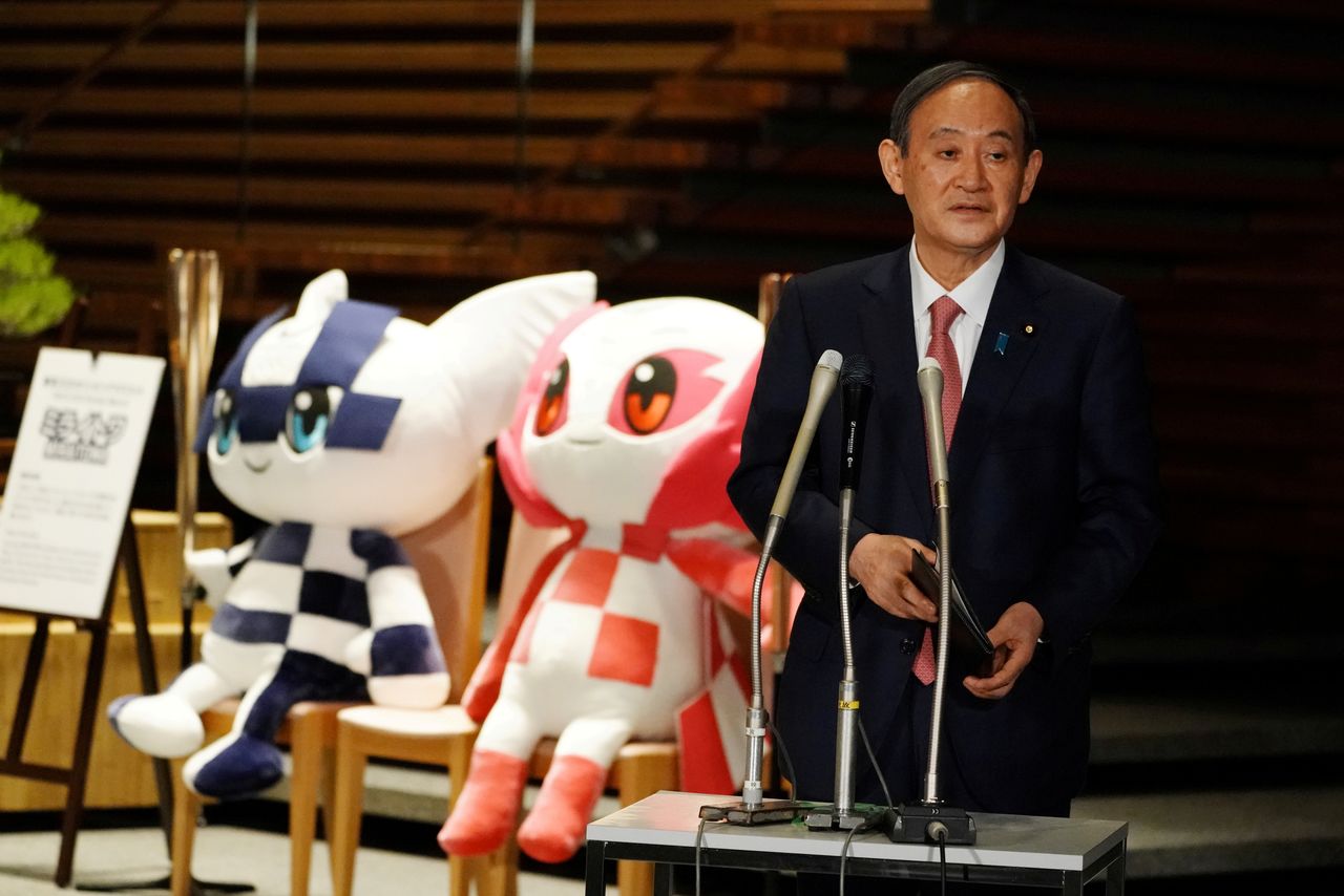 FILE PHOTO: Japanese Prime Minister Yoshihide Suga, next to the mascots of Tokyo 2020 Olympic and Paralympic Games, speaks to media after announcing that Tokyo, Kyoto and Okinawa will be applied for pre-emergency status under a new prevention law during a government task force meeting at the prime minister's office in Tokyo, Japan April 9, 2021. Eugene Hoshiko/Pool via REUTESR/File Photo