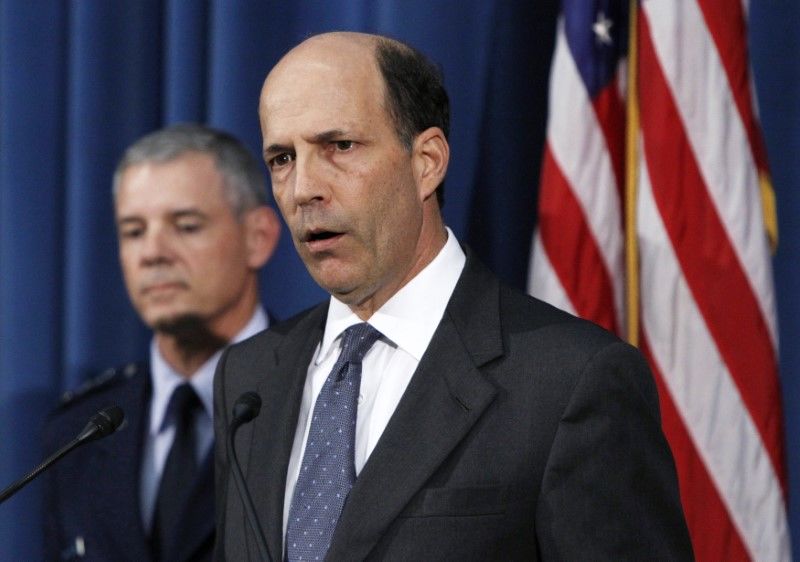 FILE PHOTO: U.S. Ambassador to Japan John Roos (R), flanked by Lt. Gen. Salvatore Angelella, commander of U.S. Forces Japan, delivers a statement at the U.S. Embassy in Tokyo October 19, 2012. REUTERS/Issei Kato