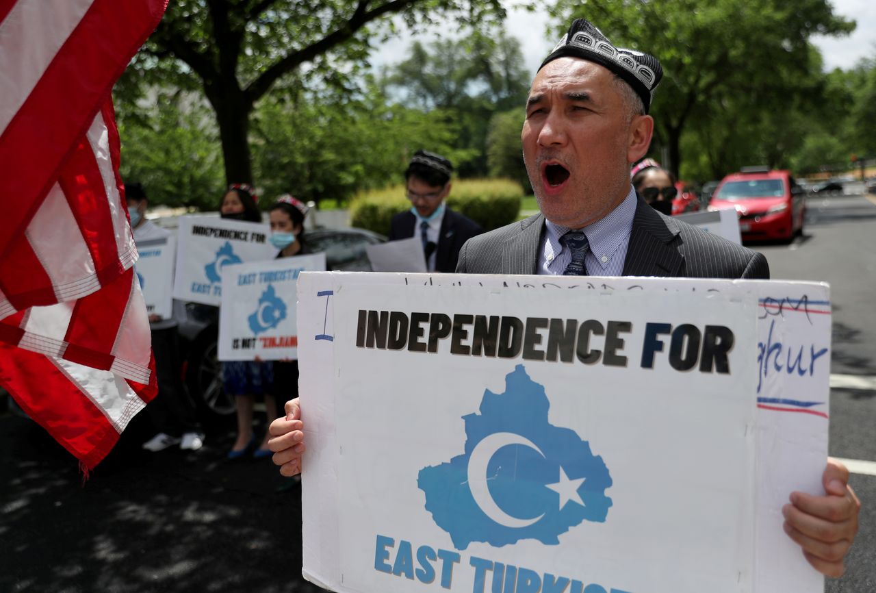 FILE PHOTO: Demonstrators, including Aziz Sulayman, hold a protest in front of the U.S. State Department to commemorate Uyghur Doppa Day and to urge the U.S. and the international community to take action against China's treatment of the Uyghur people in the East Turkistan (Xinjiang) region, in Washington, U.S. May 5, 2021. REUTERS/Leah Millis